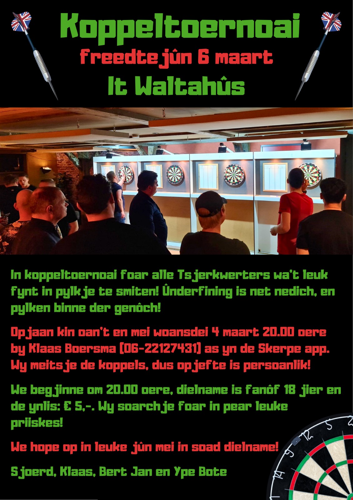 Opjaan kin oan’t en mei woansdei 4 maart 20.00 oere by Klaas Boersma (06-22127431) as yn de Skerpe app. Wy meitsje de koppels, dus op jefte is persoanlik!